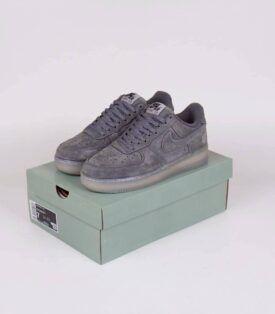 Nike Air Force 1 Reigning Champ Grey adalah sepatu kets berwarna abu-abu dengan bahan suede di seluruh bagian atasnya. Sepatu ini memiliki detail sol luar yang transparan atau tembus pandang berwarna abu-abu asap, dengan pola grid hitam di bawahnya. Bagian lidah dan talinya juga berwarna abu-abu. Bagian samping sepatu menampilkan logo Nike Swoosh yang terbuat…