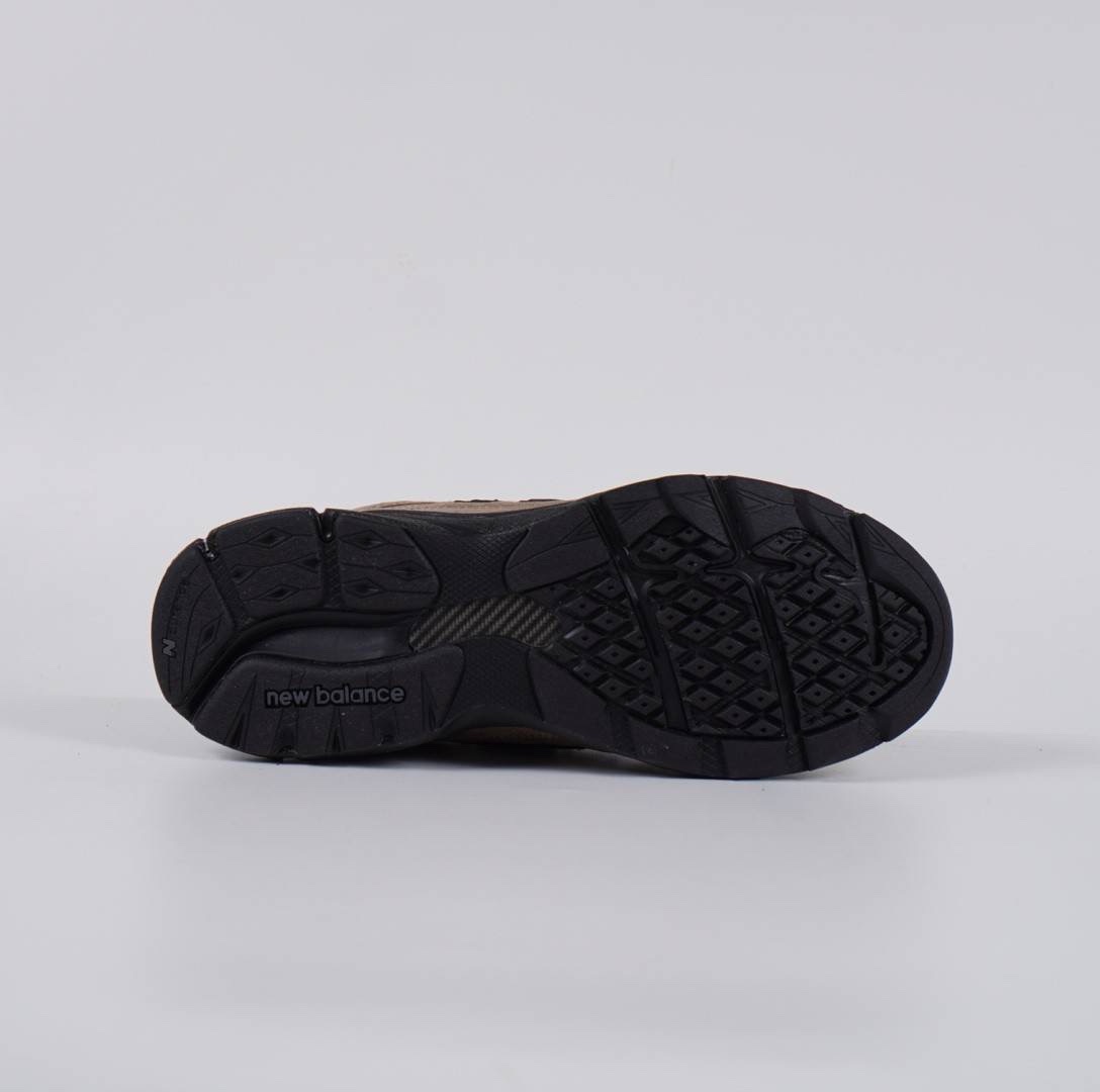 - Desain: Sepatu ini memiliki desain berpanel dengan detail jaring dan logo “N” di bagian samping. Warna cokelat gelap mendominasi sepatu, termasuk logo “N”, tali sepatu, dan sol luar. Terdapat tulisan “New Balance USA” dan “990” di bagian lidah dan tumit sepatu.