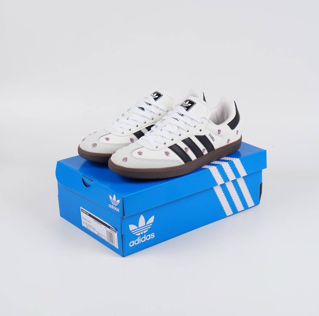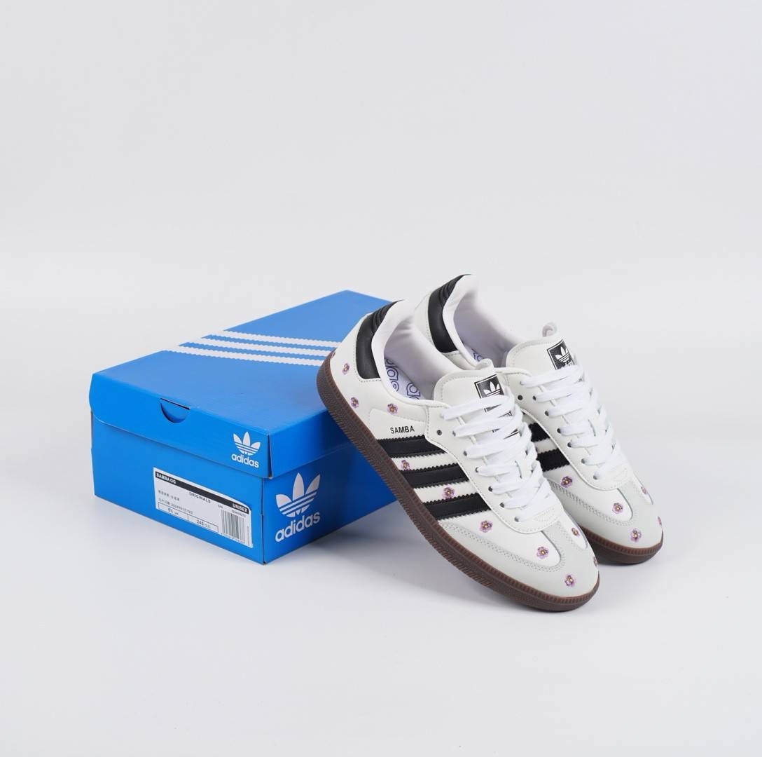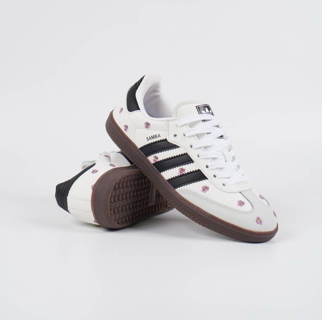 - Desain: Sepatu ini menampilkan desain klasik Adidas Samba dengan sentuhan feminin berupa bordir bunga berwarna ungu atau merah muda di bagian atasnya yang terbuat dari kulit premium. Garis-garis khas Adidas berwarna hitam kontras dengan warna dasar sepatu yang putih bersih.