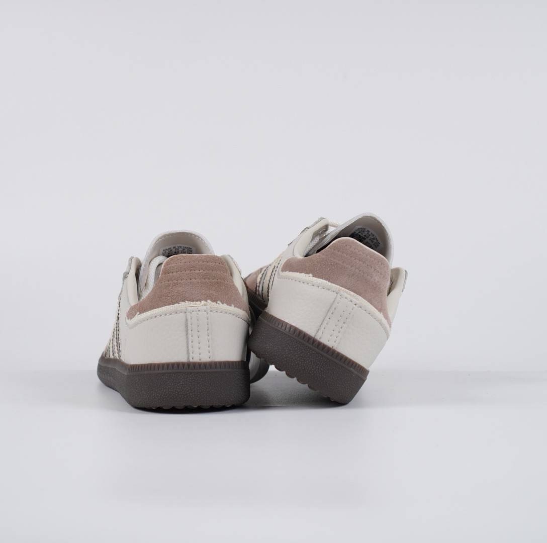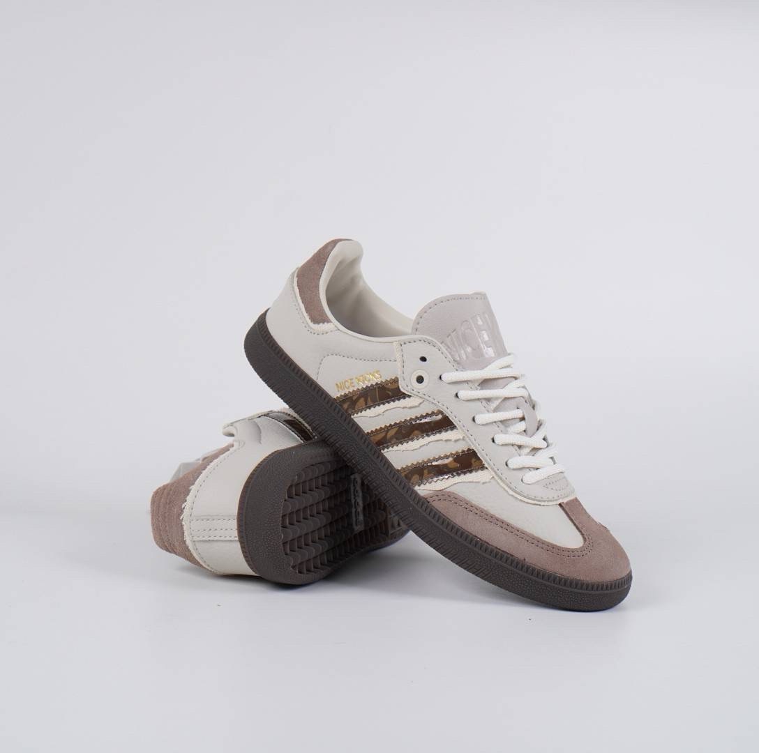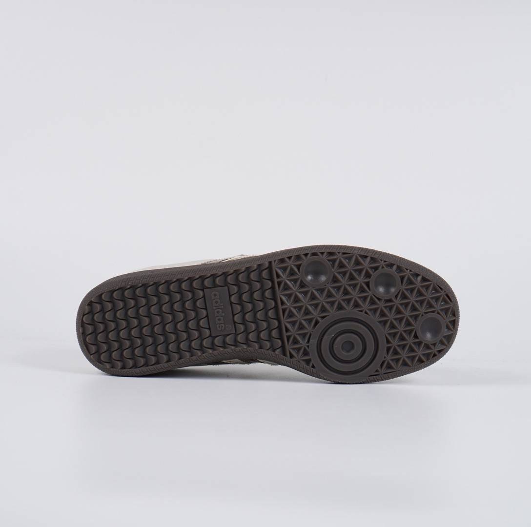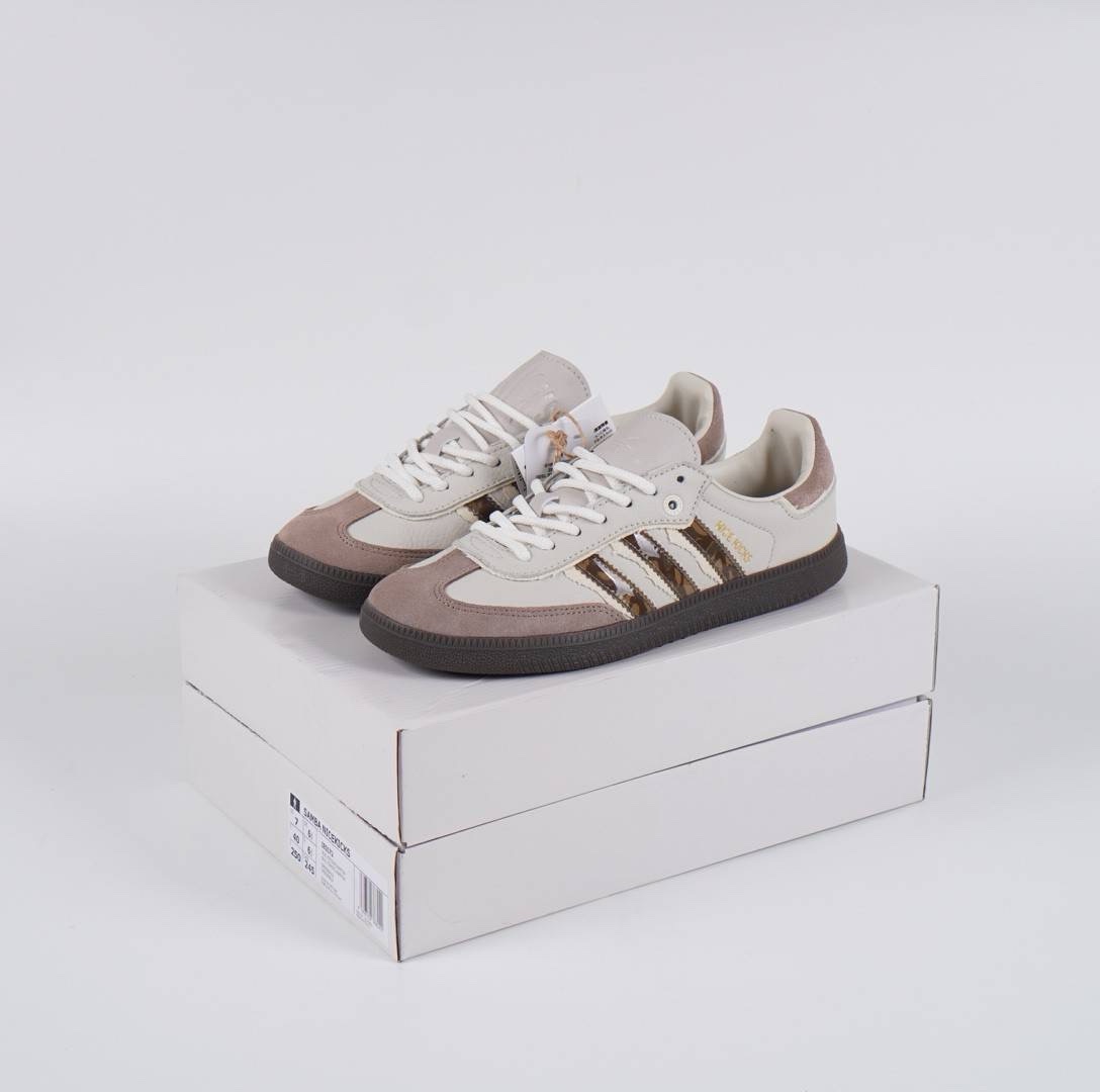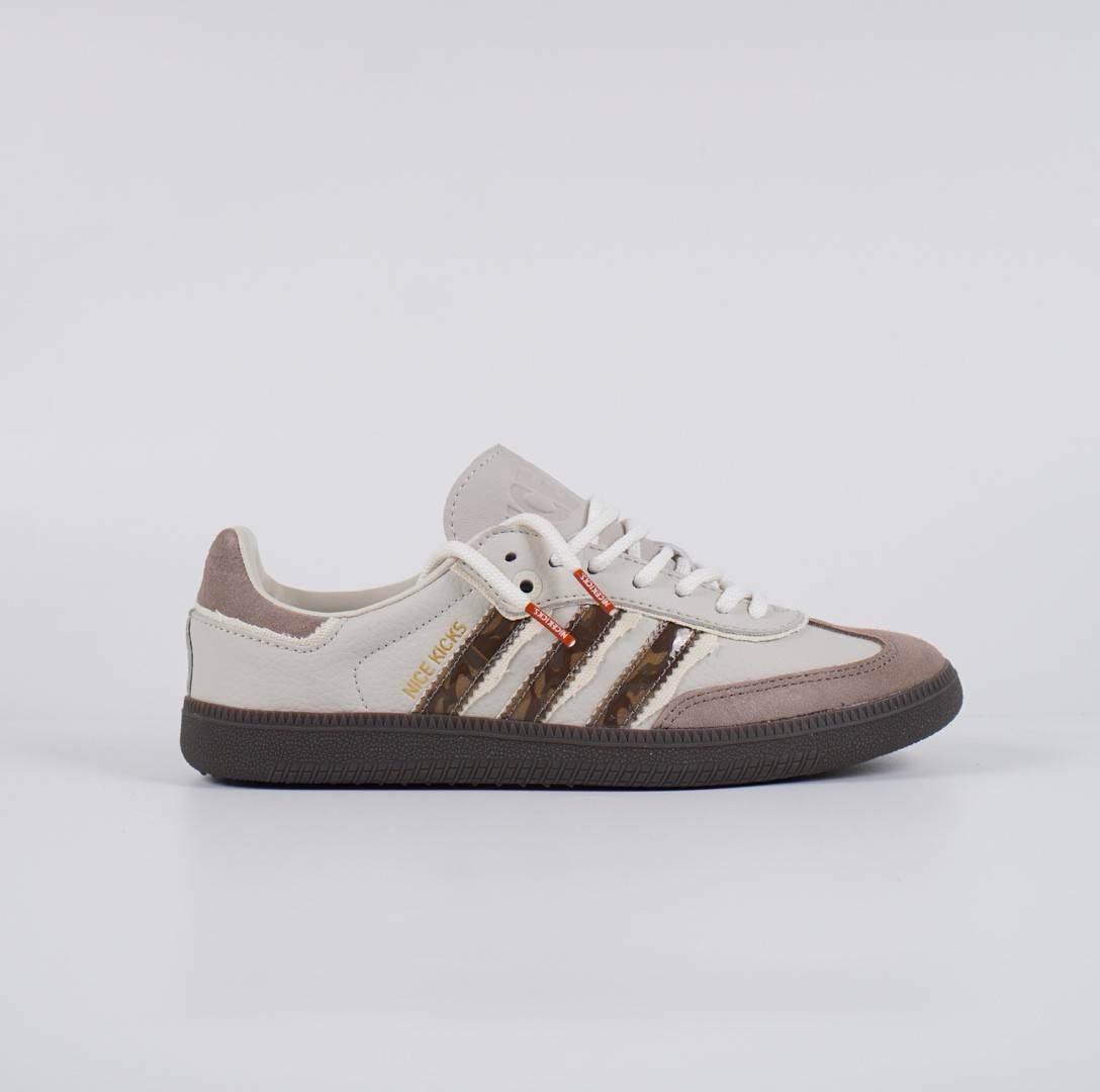 - Desain dan Bahan: Sepatu ini memiliki desain klasik Samba yang dipadukan dengan sentuhan modern, menggunakan kombinasi warna Talc (putih kekuningan), Brown (cokelat), dan Pantone. Sepatu ini dibuat dengan bahan kulit tumbled berkualitas tinggi yang berpadu dengan lapisan suede pada bagian ujung sepatu dan tab tumit.