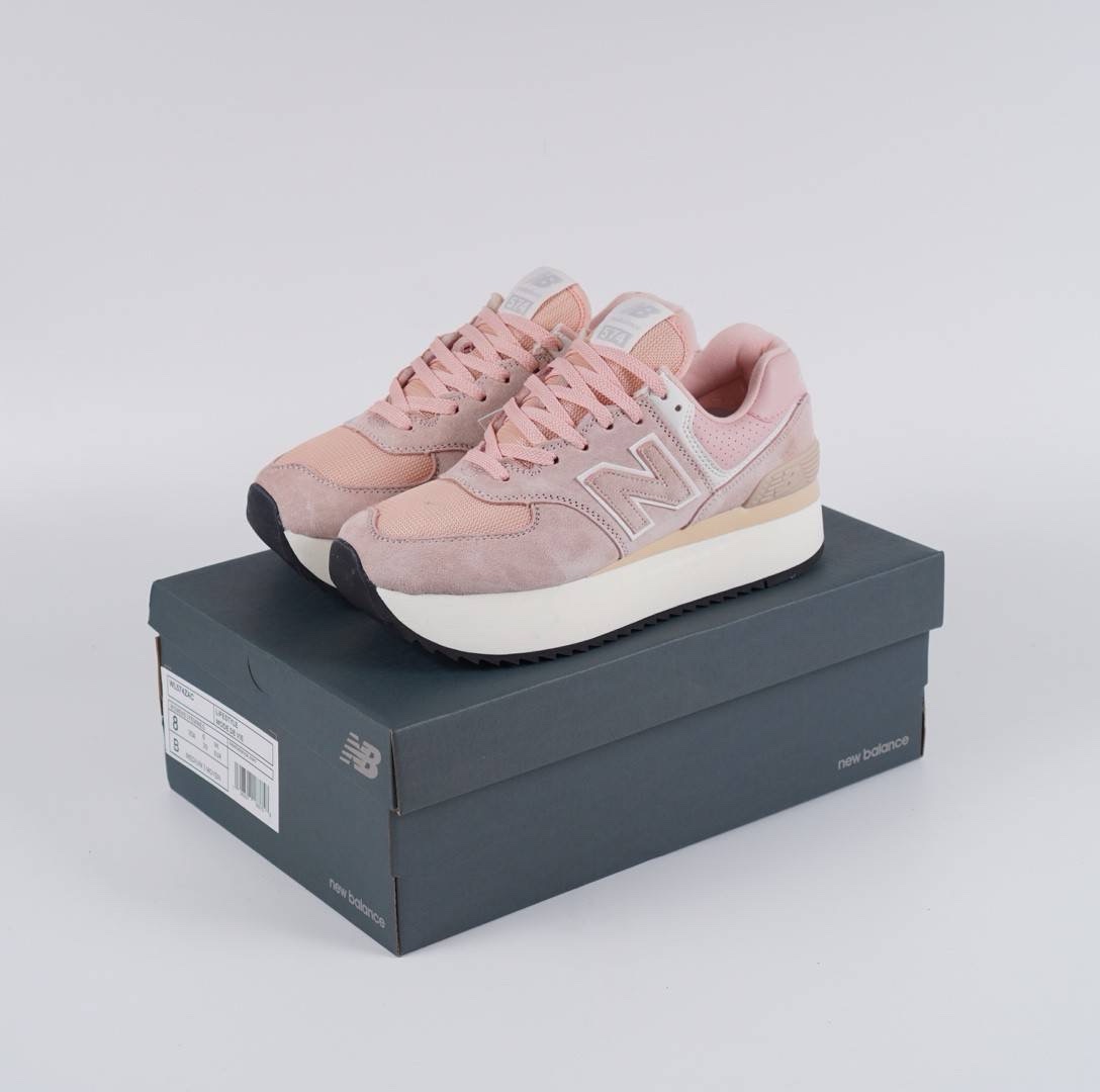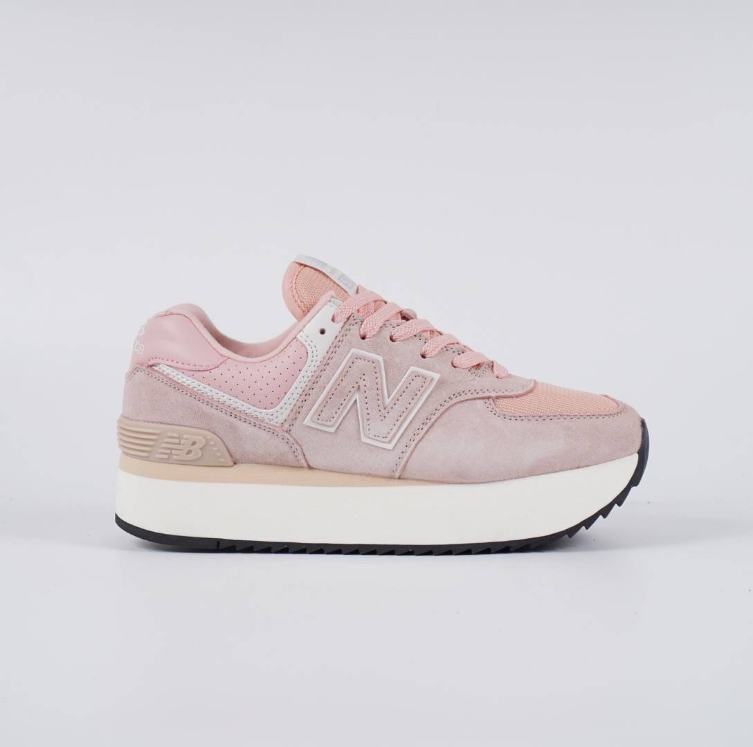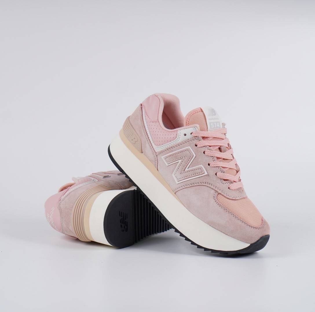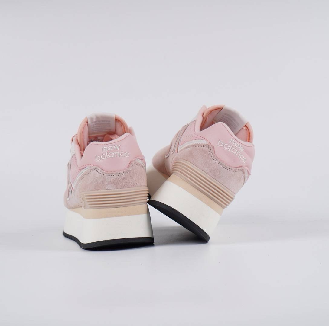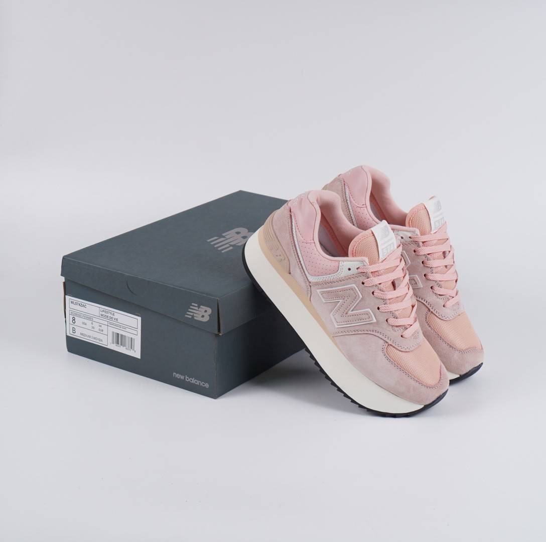New Balance 574 Platform (Model WL574ZAC) dalam warna pink dengan sol putih.