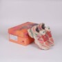 - Desain dan Material: Sepatu ini memadukan elemen desain tradisional dari seri 990 New Balance dengan detail futuristik dari era Y2K. Sepatu ini memiliki upper berbahan jaring (mesh) berwarna merah muda pastel dengan lapisan suede berwarna cokelat muda.