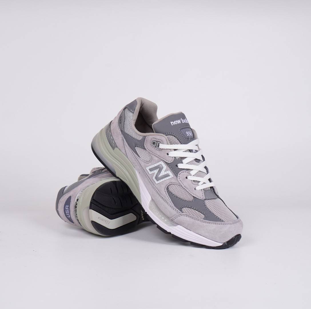 New Balance 992 berwarna abu-abu dengan kotak Made in USA.