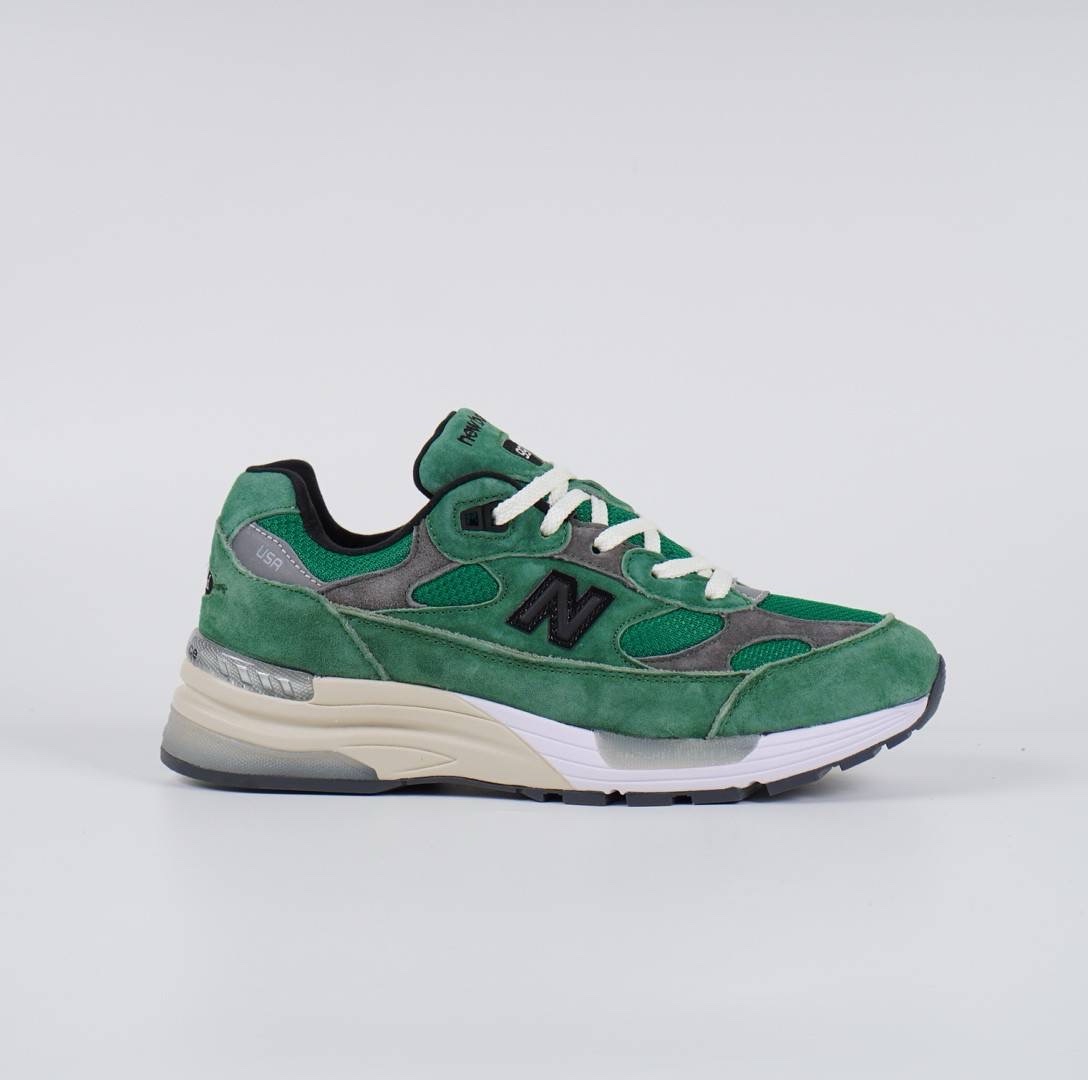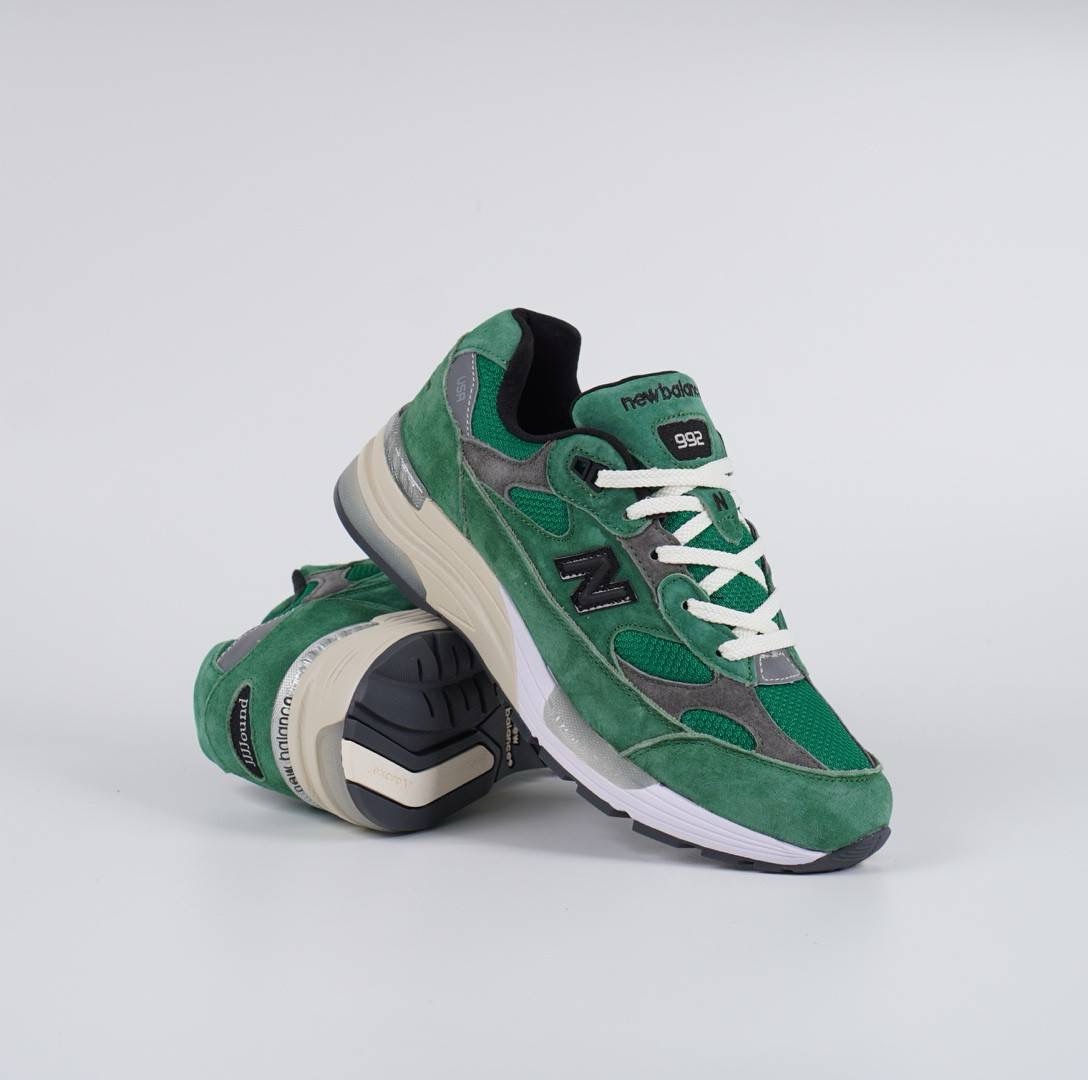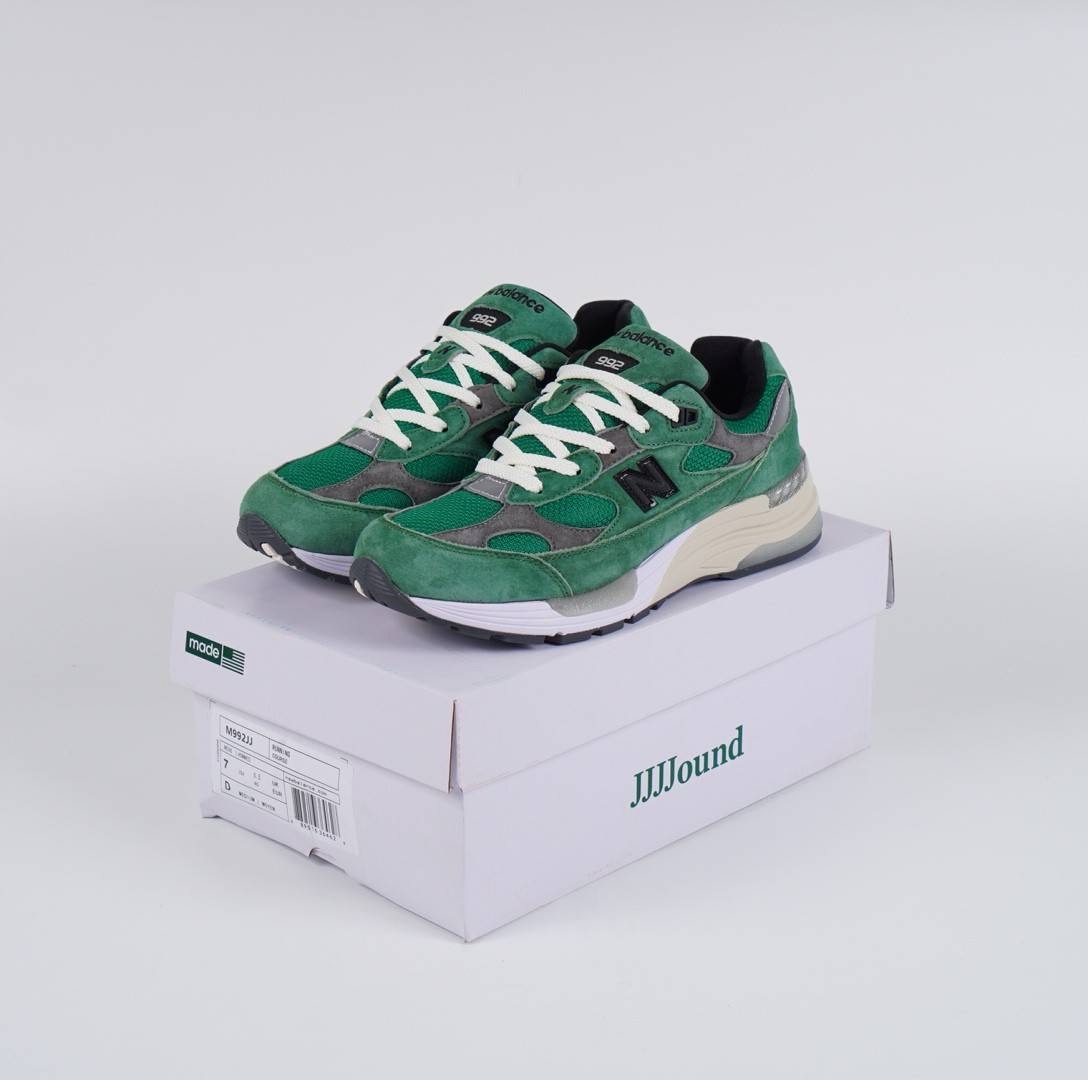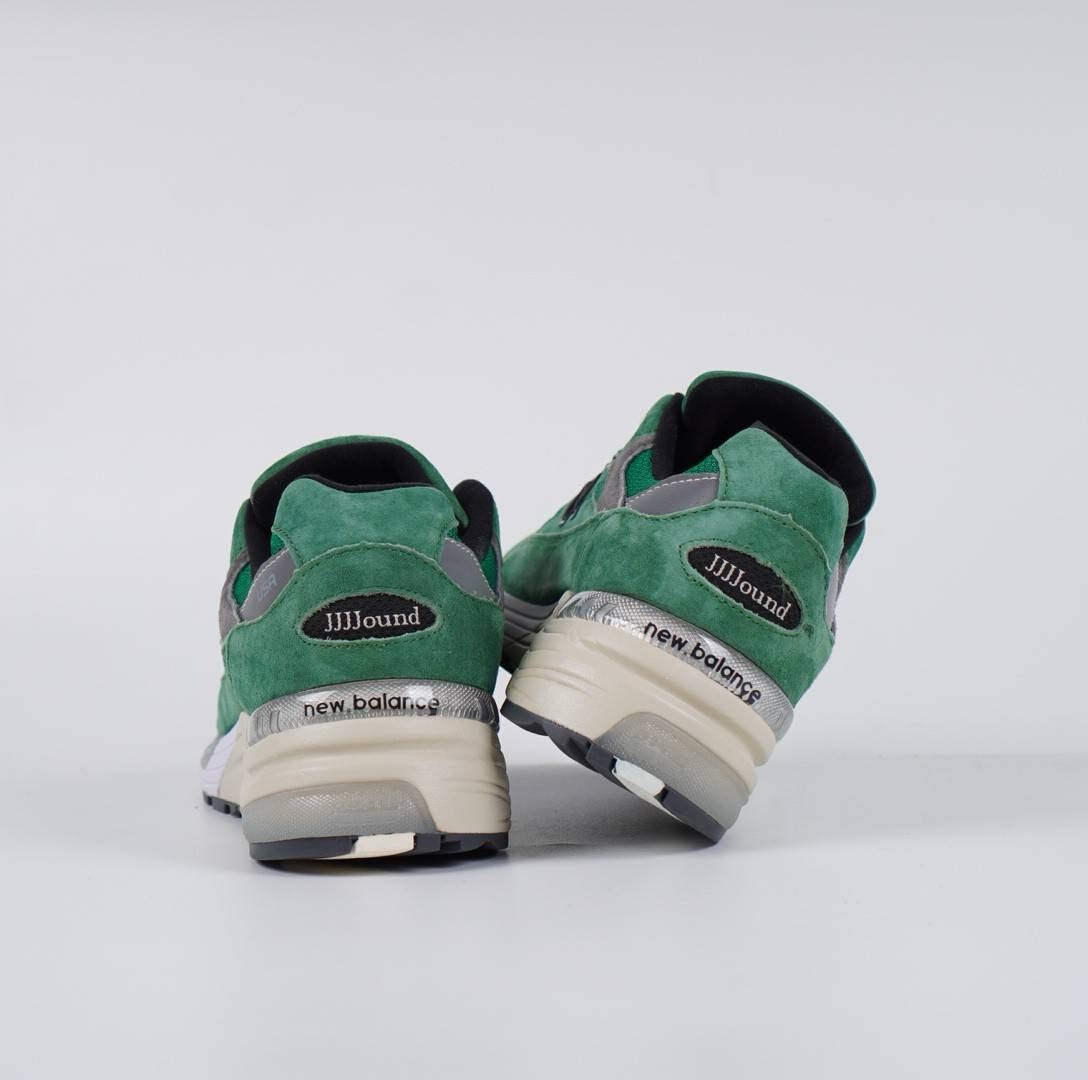 New Balance 992 x JJJJound “Green”. Sepatu ini merupakan hasil kolaborasi antara merek New Balance dengan studio desain asal Montreal, JJJJound, yang dikenal dengan gaya minimalisnya. Sepatu ini dirilis pada tahun 2020 sebagai bagian dari perayaan 992, dan dikenal dengan warna hijau lumut yang khas.