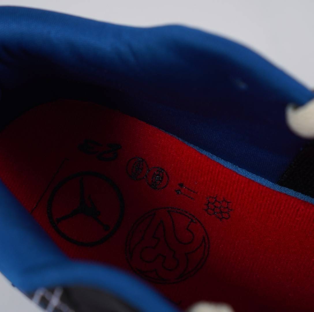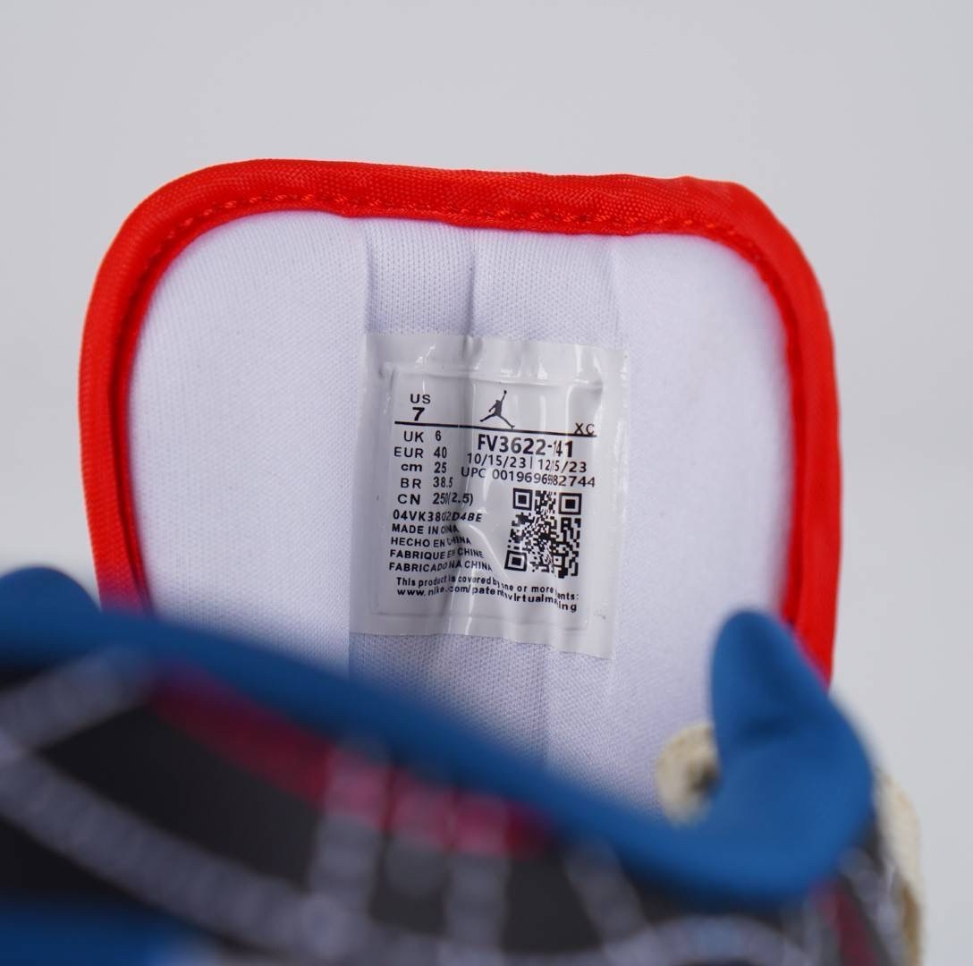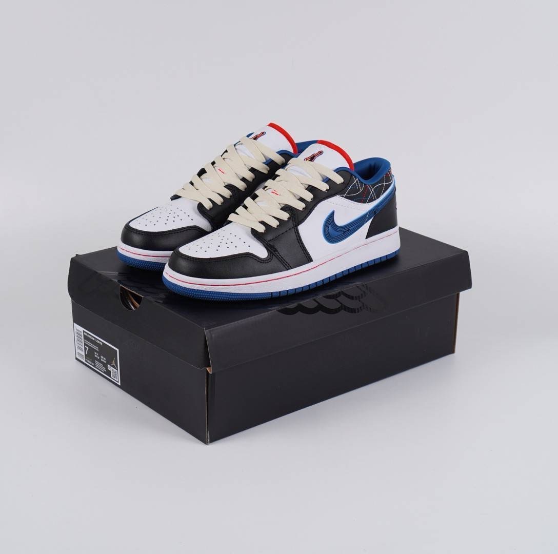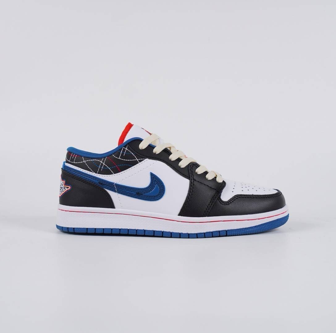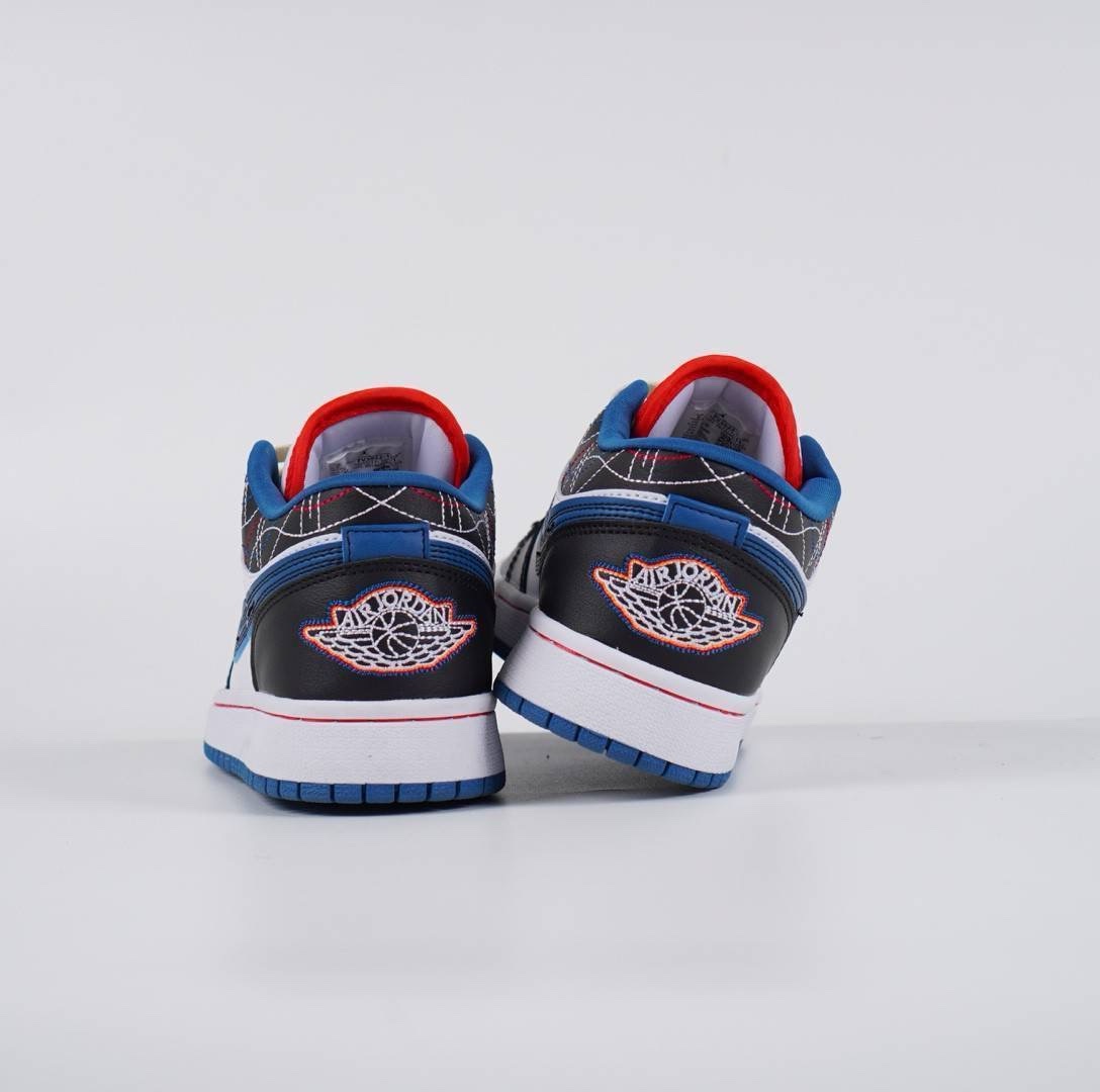 adalah sepatu sneaker dengan desain klasik Air Jordan 1 Low yang dipadukan dengan sentuhan modern. Sepatu ini memiliki kombinasi warna hitam, putih, biru, dan merah dengan detail Sashiko yang unik pada bagian samping.