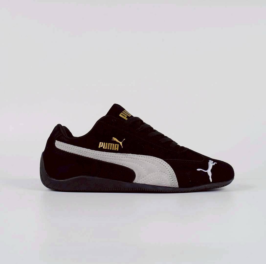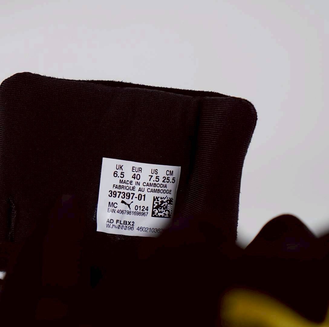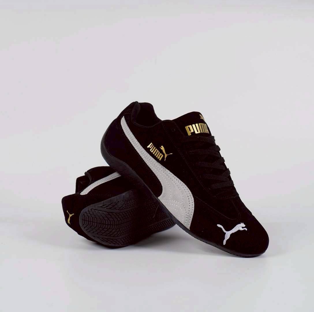 • Warna: Hitam dan putih, dengan logo Puma berwarna emas pada bagian samping dan lidah sepatu.