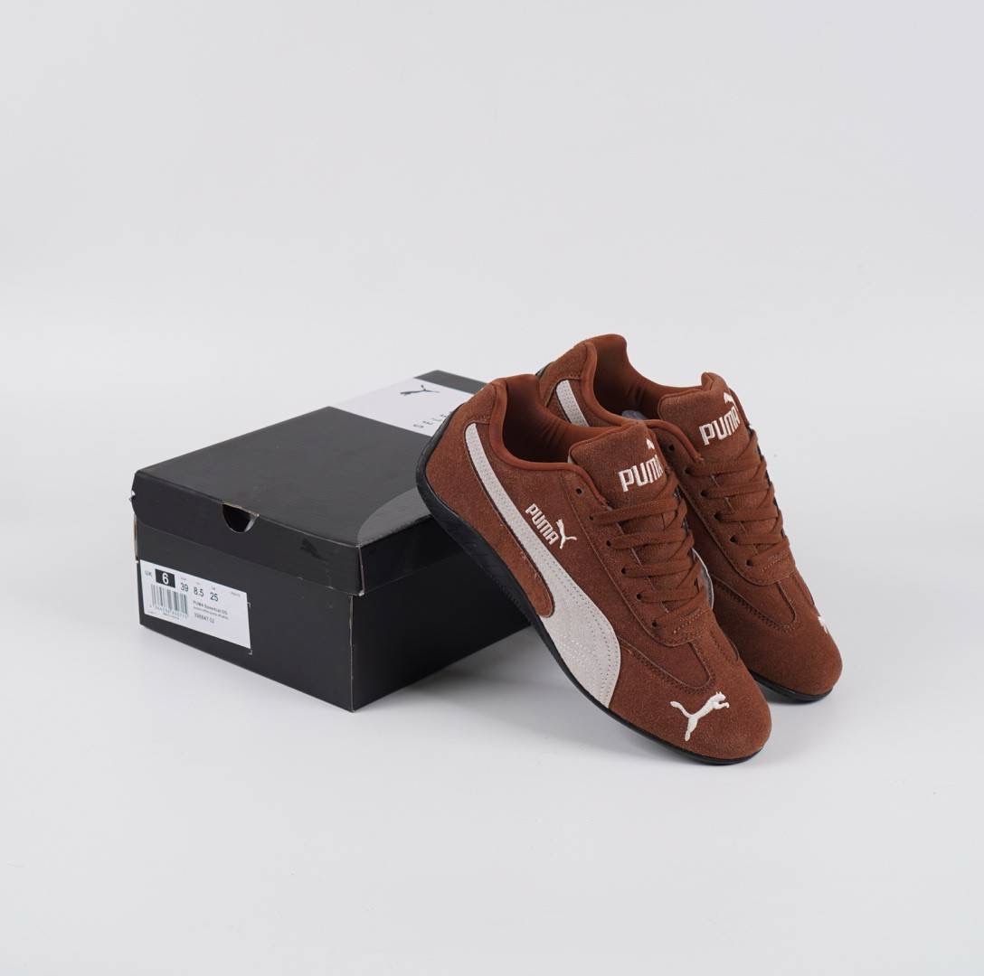 Puma Speedcat OG dalam warna Haute Coffee(atau terkadang disebut brown coffee atau dark brown). Sepatu ini merupakan sepatu kets unisex yang terinspirasi dari sepatu balap.