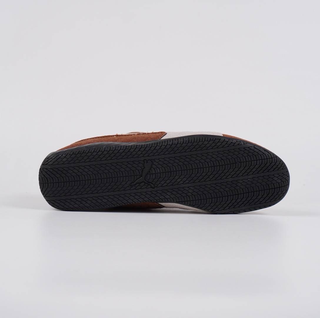 - Bahan: Upper sepatu terbuat dari bahan suede berwarna coklat, dengan Formstrip (garis Puma) dan logo Puma di bagian samping dan belakang yang dibordir dengan warna putih atau frosted ivory.